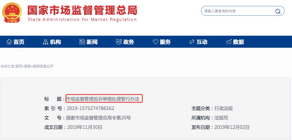 12月2日,国家市场监督管理总局发布《市场监督管理投诉举报处理暂行办法》(以下简称暂行办法),暂行办法将从2020年1月1日起实施。规定“不是为生活消费需要购买、使用商品或者接受服务,或者不能证明与被投诉人之间存在消费者权益争议的“,市场监管部门不予受理,意味着以 "打假"等名义实施恶意投诉的"职业索赔"行为将受到规制。其他部分投诉不予受理的情形,还包括:法院、仲裁机构、市场监督管理部门或者其他行政机关、消费者协会或者依法成立的其他调解组织已经受理或者处理过同一消费者权益争议的;除法律另有规定外,投诉人知道或者应当知道自己的权益受到被投诉人侵害之日起超过三年的等。这表示,以“打假”等名义实施恶意投诉的“职业索赔”行为将受到规制。![]()