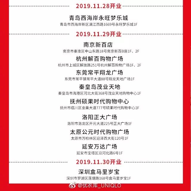 停牌三年,倾力自救后,富贵鸟依然是难逃港交所退市的命运。11月21日晚间富贵鸟在港交所公告,宣告富贵鸟终将要接受港交所此前对其取消上市地位的安排,于25日起正式退市。对于外界关注的“烧钱”问题,呆萝卜创始人兼CEO李阳表示,呆萝卜一共收获了7亿多人民币等值美金的融资,这些资金全部真实到账,且都投入到公司的发展使用,不存在“虚假”或者“未到”的问题,同时,“低估了生鲜的烧钱速度。”对于目前公司产生的问题,李阳表示他负有最大的责任,呆萝卜在积极寻求解决方案。(亿邦动力)随着路易威登母公司路威酩轩集团(LVMH)与美国珠宝品牌蒂芙尼公司达成最终协议,正式收购蒂芙尼,微软联合创始人比尔·盖茨和亚马逊创始人兼首席执行官杰夫·贝佐斯这两位全球首富可能很快就会发现,自己的身价或将低于LVMH的掌门人。根据《福布斯》跟踪的实时财富排行榜,LVMH集团董事长兼首席执行官伯纳德-阿尔诺目前的身价超过1060亿美元。周一,路威酩轩集团以163亿美元的价格收购蒂芙尼(Tiffany)后,阿尔诺的净资产随着路威酩轩集团的股价上涨了1%以上。阿尔诺和他的家族拥有这家法国奢侈品巨头超过47%的股份。(新浪财经)11月24日晚间,优衣库官方微博发布消息称,11月28日至11月30日,优衣库全国10城10店将陆续开业,分别进驻青岛西海岸永旺梦乐城、南京新百B座、杭州解百购物广场、东莞常平翔龙广场、秦皇岛茂业天地、抚州硕果时代购物中心、洛阳正大广场、太原公元时代购物广场、延安万达广场、深圳盒马岁宝里。![]()