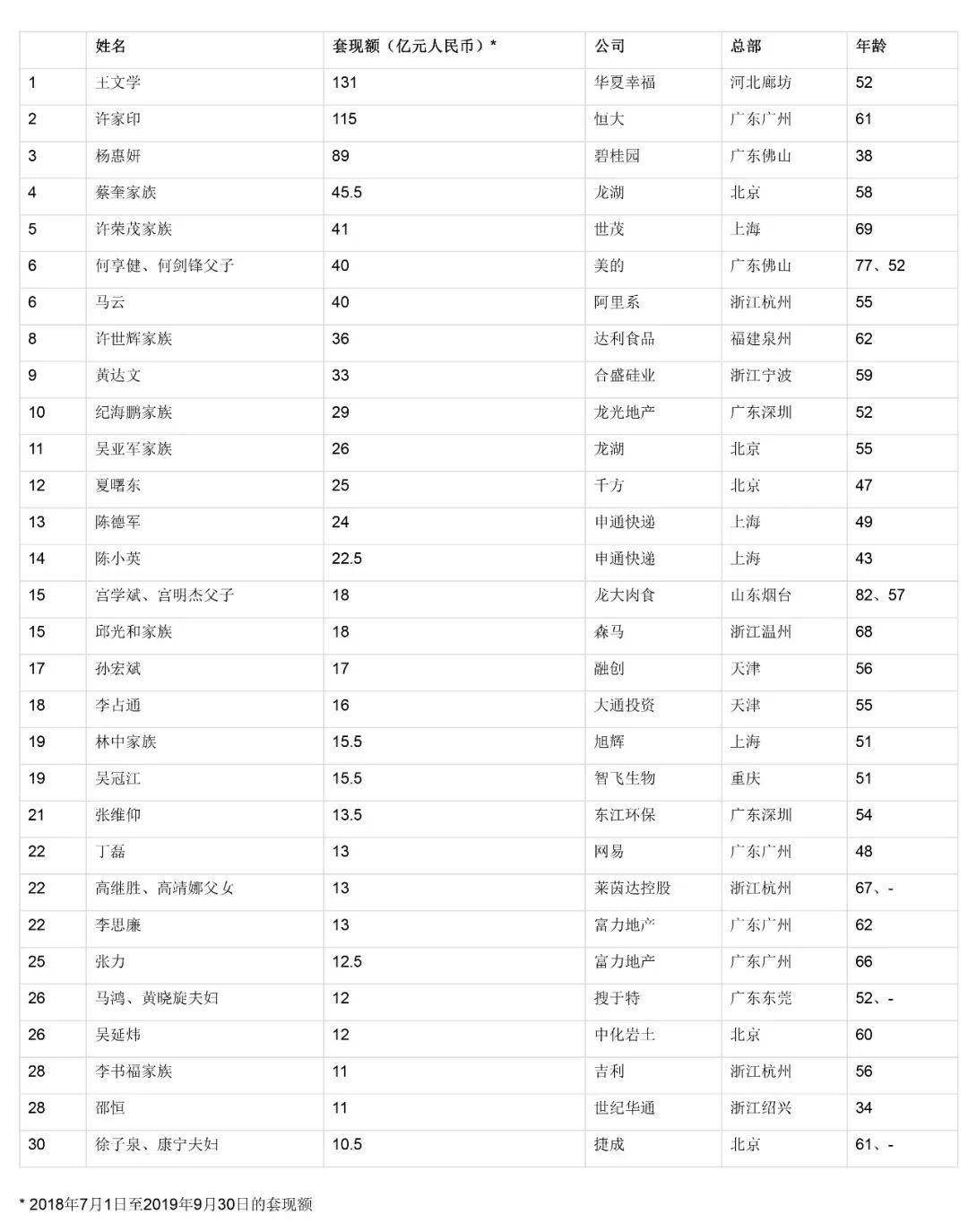 11月21日上午,胡润发布了《2019胡润套现企业家30强》,统计了自2018年7月1日至2019年9月30日各上榜企业家的套现金额。其中这三十位上榜的企业家一共套现918.5亿,较去年增加10%,为历年来最多的一次。科技圈中,去年7月至今,马云家族通过减持美股上市公司阿里巴巴的部分股权,套现40亿元排名第6,而丁磊通过所持有的美股上市公司网易获得分红13亿元。(网易科技)2019世界5G大会于21日在京开幕。记者从大会上获悉,年底北京市将基本实现五环以内5G信号全覆盖。据介绍,截至10月底,北京市5G网络信号已覆盖长安街沿线、重要商圈、大兴国际机场、城市副中心等,年底有望超过1.4万个基站投入使用,基本实现五环内覆盖,而2022年北京冬奥会也将重点在超高清视频、VR/AR、智慧园区、远程医疗、智能交通等重要场景应用5G。(北京青年报)11月19日,王思聪被北京市第二中级人民法院发布限制消费令。北京市第二中级人民法院于2019年11月04日立案执行申请人嘉兴璟字悌为股权投资基金合伙企业(有限合伙)申请执行王思聪国内非涉外仲裁裁决一案,因王思聪未按执行通知书指定的期间履行生效法律文书确定的给付义务,因此北京市第二中级人民法院对其采取限制消费措施。此前,王思聪被上海市嘉定区人民法院下达限制消费令,后取消。(中新网)5、罗永浩正式官宣:12月3日将举办“老人与海”黑科技发布会11月21日消息,罗永浩在微博上宣布,12月3日晚上19点30于北京举行“老人与海”黑科技发布会。罗永浩表示,“此次发布会门票不对外出售,我们决定以赠票的形式发放给长年支持我们的老朋友”。6、阿里港股上市拟支付3220万美元承销费,将筹集129亿美元资金据外媒消息,根据阿里巴巴提交给美国证券交易委员会的文件,针对在港交所上市的承销服务,阿里巴巴将向投资银行支付3230万美元的承销费。阿里巴巴将通过此次上市筹集高达129亿美元的资金。阿里巴巴此次在港交所上市,聘用中金公司和瑞士信贷公司作为主承销商。除了两家主承销商之外,其他投资银行也参与了阿里巴巴新股票的承销工作,包括美国花旗集团、摩根大通银行、摩根士丹利公司。(腾讯科技)7、WeWork裁员2400人,占员工总数约20%WeWork证实,为了削减成本和调整业务规模,该公司将裁减2400名员工。WeWork发言人发表声明称,该公司正努力致力于“打造一个更加高效的组织”,并重新把重点放回到核心办公室共享业务上去。根据SEC此前收到的一份声明,此次裁员人数在WeWork员工总数中所占比例为19%。截至6月30日,WeWork的员工总数为1.25万人。(新浪科技)本文来源:中国零售网 授权转载