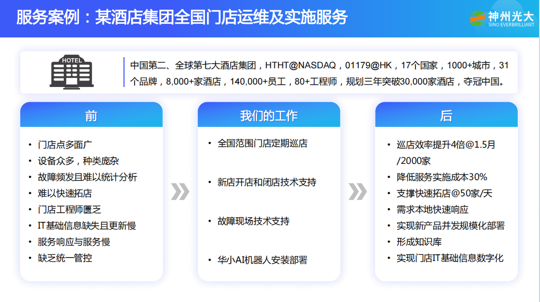 借助于自建的IT平台及全国分布的工程师资源,在连锁领域服务过华住酒店集团,屈臣氏,海底捞,贝壳,广汽,茅台,安踏等知名客户。能够完成从开店,门店运维,闭店一站式的IT服务工作。