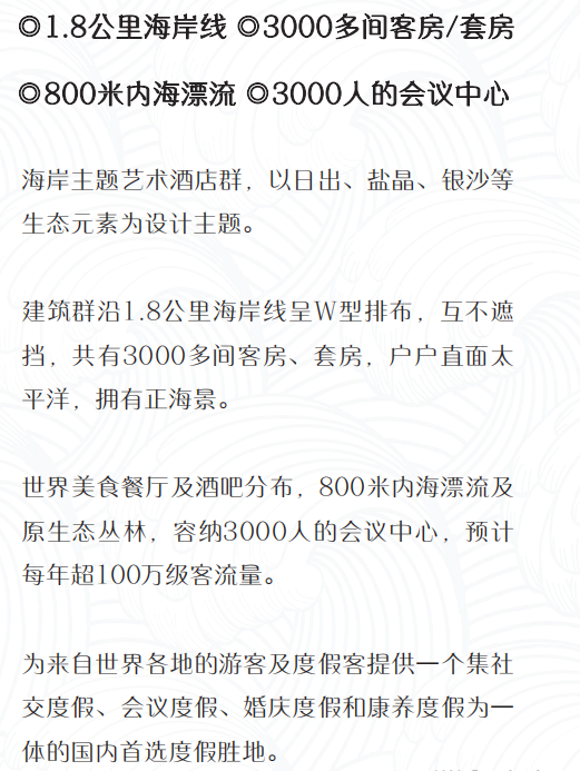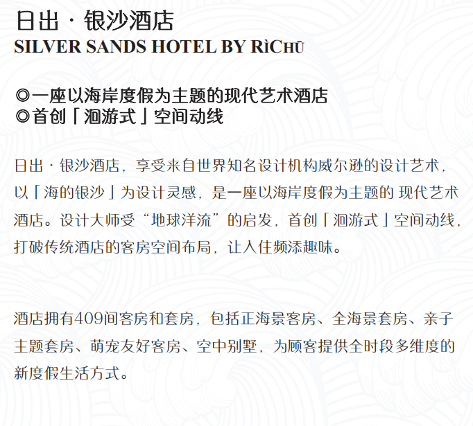 日出东山海度假区内配备有极具特色的酒店群,目前已开业的分别是以“海的银沙”为设计灵感的日出•银沙酒店,以及以惠州本地的千年海“盐”文化为灵感的日出·盐晶酒店,它们均来自世界知名设计机构威尔逊之手,由迪拜亚特兰蒂斯酒店的原创团队设计。两家酒店共拥有逾800间客房和套房,房间面积58㎡起,拥有独立阳台,并独创全隐藏阳台门,每间房均可180度-270度正面欣赏优美海景。