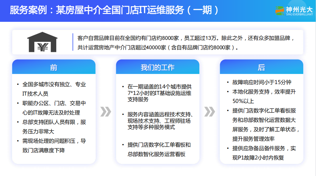 技术创新:神州光大与国家级科研机构背景的AI公司建立联合实验室,专注于AI大模型技术,打造了中国首个IT运维服务领域的垂直大模型“IT运维大脑”,助力千行百业降低IT服务成本、提升IT服务质量和增加IT服务效益;