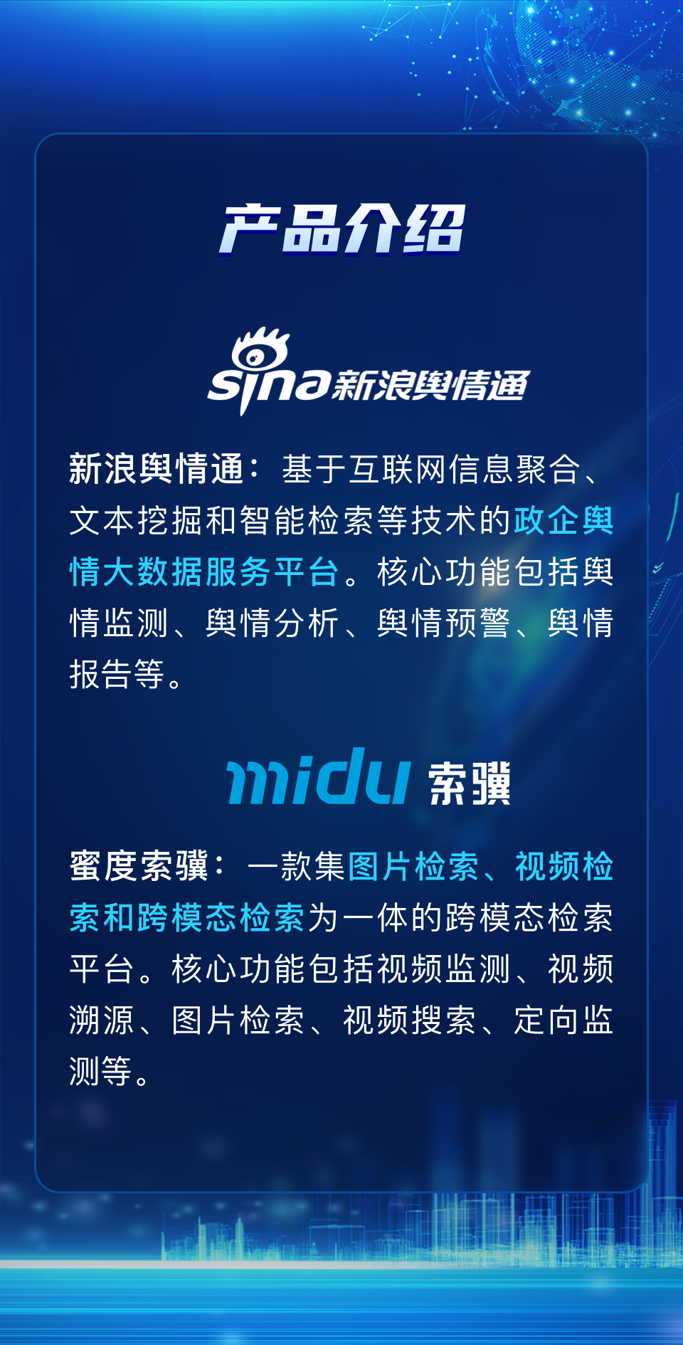 上海蜜度科技股份有限公司是新浪微博与人民网旗下企业,多年来致力于:为政企解决互联网端全网品牌舆情监测与服务,通过大数据分析,为政企客户提供市场品牌数据差异化分析、竞品分析、舆情突发事件监测与突发事件应急预案处置等。总部位于上海,现国内已设30余个办事处,服务政府客户超过20000余家,企业客户超10000家。