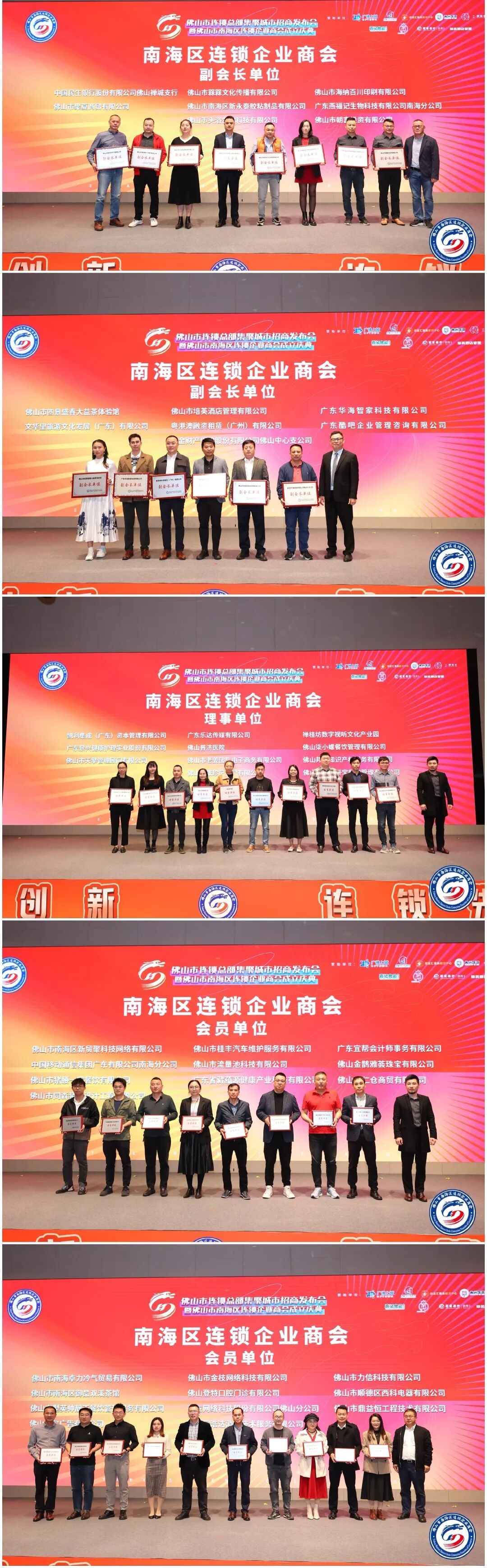 南海区连锁企业商会自成立以来,为推进佛山市南海区连锁行业的发展,挖掘及推广不少南海区本地最具成长性的连锁企业,行业类别有批发零售、餐饮行业、通讯信息行业、美容美发行业、广告传媒行业、金融投资行业、保险行业、旅游行业等等总共 200 多家企业,现对会长单位及新进会员企业进行牌匾颁发。