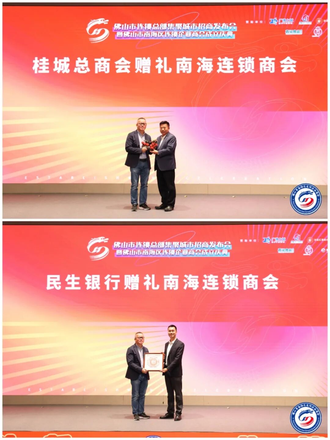 在这个喜庆的日子,桂城总商会及中国民生银行佛山分行分别向南海连锁商会送赠成立礼品。