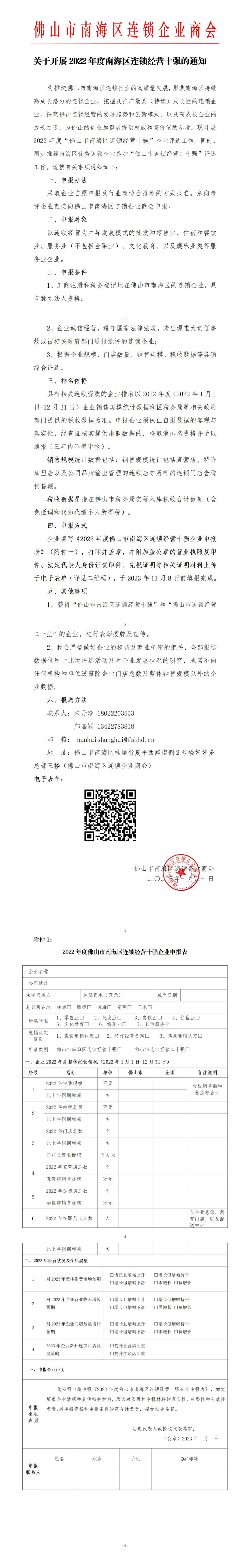 企业填写《2022年度佛山市南海区连锁经营十强企业申报表》(附件1),打印并盖章,并附加盖公章的营业执照复印件、法定代表人身份证复印件、完税证明等相关证明材料上传于电子表单(详见二维码),于2023年11月8日前填报完成。