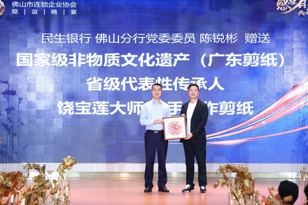 为了感谢连锁协会和姚会长的付出,协会会员中国民生银行佛山分行敬赠一幅由国家级非物质文化遗产(广东剪纸)省级代表性传承人-饶宝莲大师亲手创作的剪纸。