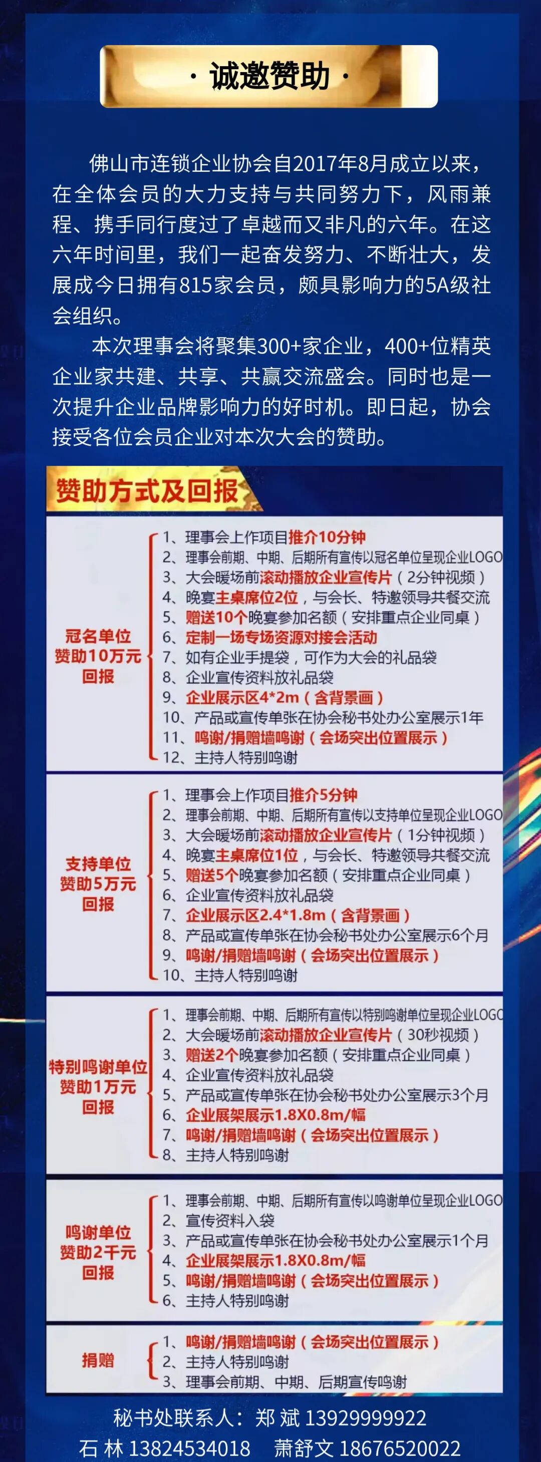 佛山市连锁企业协会成立于2017年,在佛山市商务局、禅城区经济和科技促进局的大力支持下,发展到现在已经有800+家会员企业,15000多家门店,涵盖餐饮、金融、零售等43个行业。通过六大赋能中心(金融、人才、政策、资源整合、数字化直播、孵化),六大品牌活动(党建活动、周三生意助推成交会、问道游学、连锁商学院、N+N共享茶聊、小林饭局),连锁品牌100双创中心平台,促消费类政府活动(88消费节、双创大赛、金牌导购、美食节等),实现会员间跨界合作,抱团发展,资源共享。