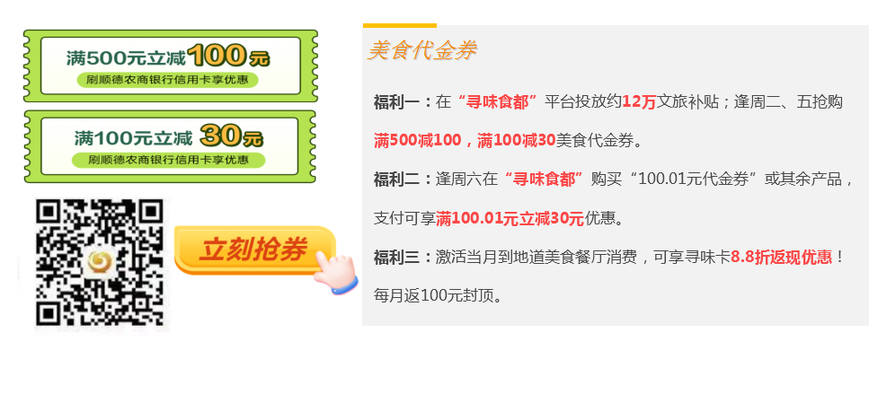 美食代金券“寻味食都”特惠顺德区联合金融机构在“寻味食都”平台上投放补贴,扫码即可参与抢券,推出满100减30,满500减100、8.8折返现等系列优惠。