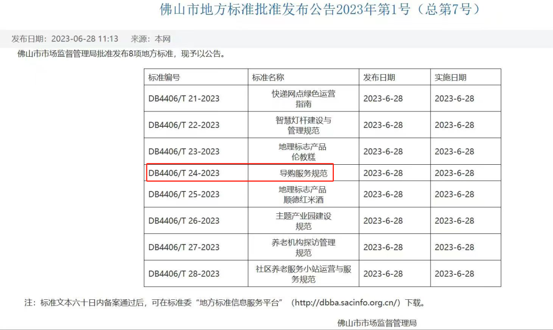 6月28日,佛山市市场监督管理局批准发布地方标准《导购服务规范》,并予以公告。