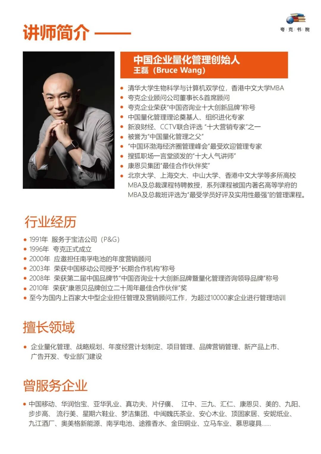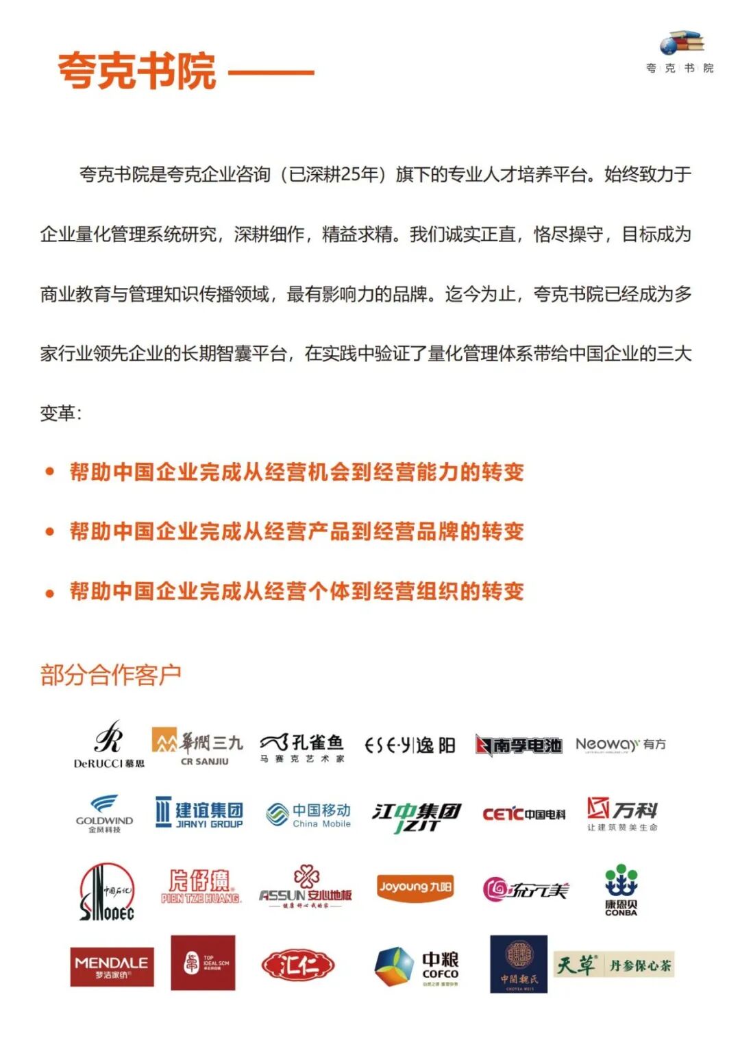 夸克书院是夸克企业咨询(已深耕25年)旗下的专业人才培养平台。始终致力于企业量化管理系统研究,深耕细作,精益求精。我们诚实正直,恪尽操守,目标成为商业教育与管理知识传播领域,最有影响力的品牌。迄今为止,夸克书院已经成为多家行业领先企业的长期智囊平台,在实践中验证了量化管理体系带给中国企业的三大变革: