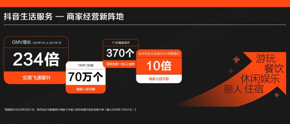 2021年1月份抖音生活服务正式启动,经过一年多发展,业务产品已经覆盖超过370个城市,合作门店超过70万家。近半年来东北数万家各行各业商家投身在生活服务平台。在东北,相对于上半年,GMV增量规模达到10倍以上,让更多好店铺被发现,更多好服务被体验。