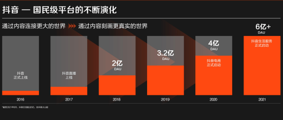 抖音是一个运营七年,日活超过6亿的国民级APP。2016年抖音上线,到2017年时候抖音直播上线,2019年日活达到3.2亿。在2021年上线了抖音生活服务业务,这一年抖音日活达到6亿以上。用内容连接世界,通过内容刻画更真实的世界一直是抖音在做的事情。