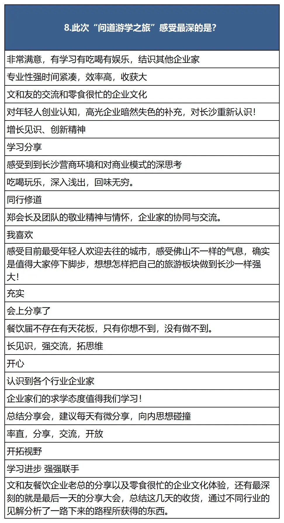 此次行程我听了部分年轻企业家的创业分享,真的很有价值,值得再延续讨论。我想组织个问道长沙之旅团友聚会,邀请大家重温旅程的收获,做一个分享座谈会,再次分享讨论商业模式的见解。