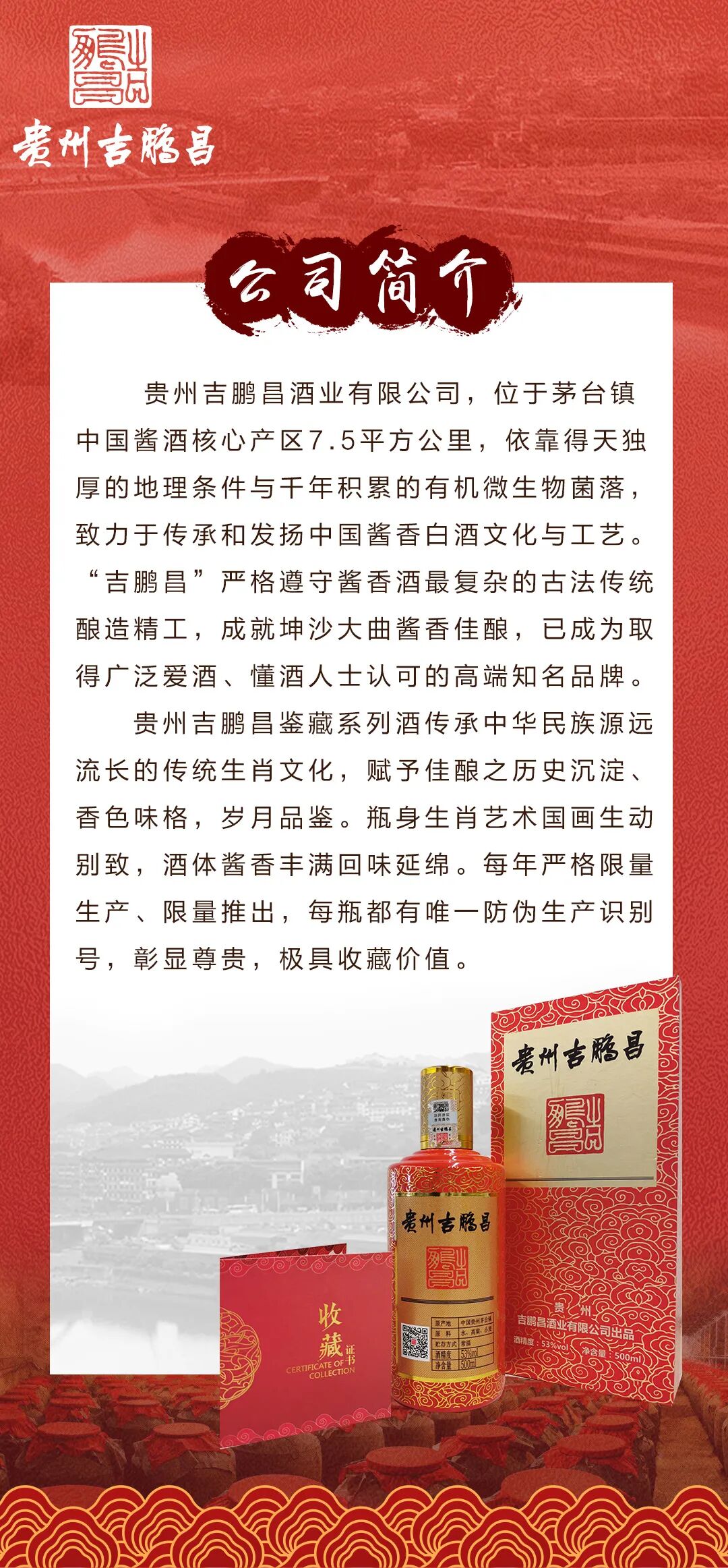 酿造文化传承千年,吉鹏昌精选上等原料,采用赤水河谷红缨子高粱,取酱酒之灵魂——赤水河水。精益求精,严守最复杂的古法坤沙酿造12987生产工艺,遵循天道、敬畏自然!