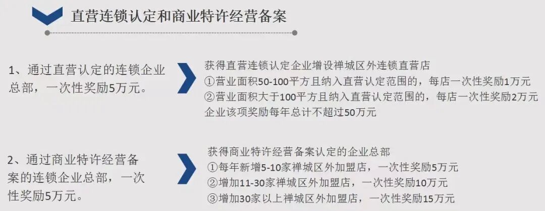 “禅城区连锁扶持办法”对在禅城区内工商注册登记并申报商业特许经营备案成功的连锁企业总部,一次性奖励50000元;对在禅城区内工商注册登记并申报直营认定成功的连锁企业总部,一次性奖励50000元。