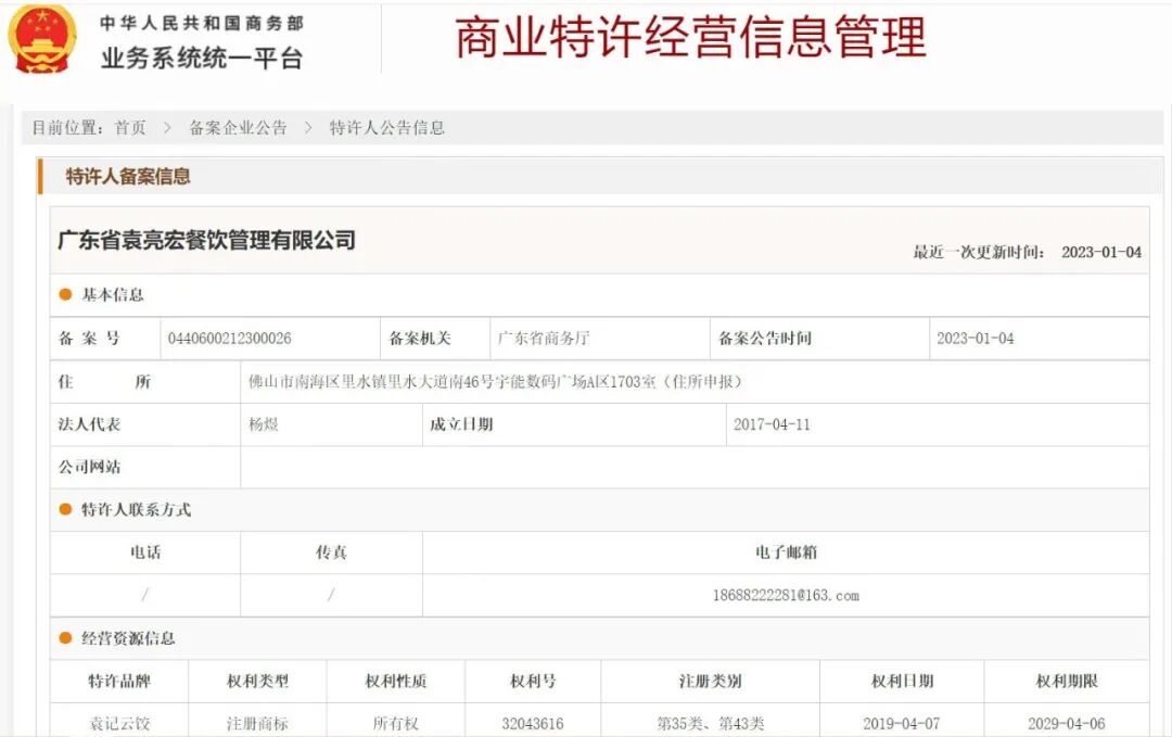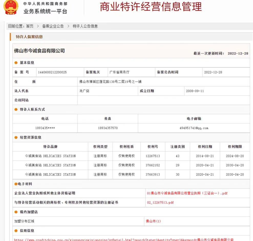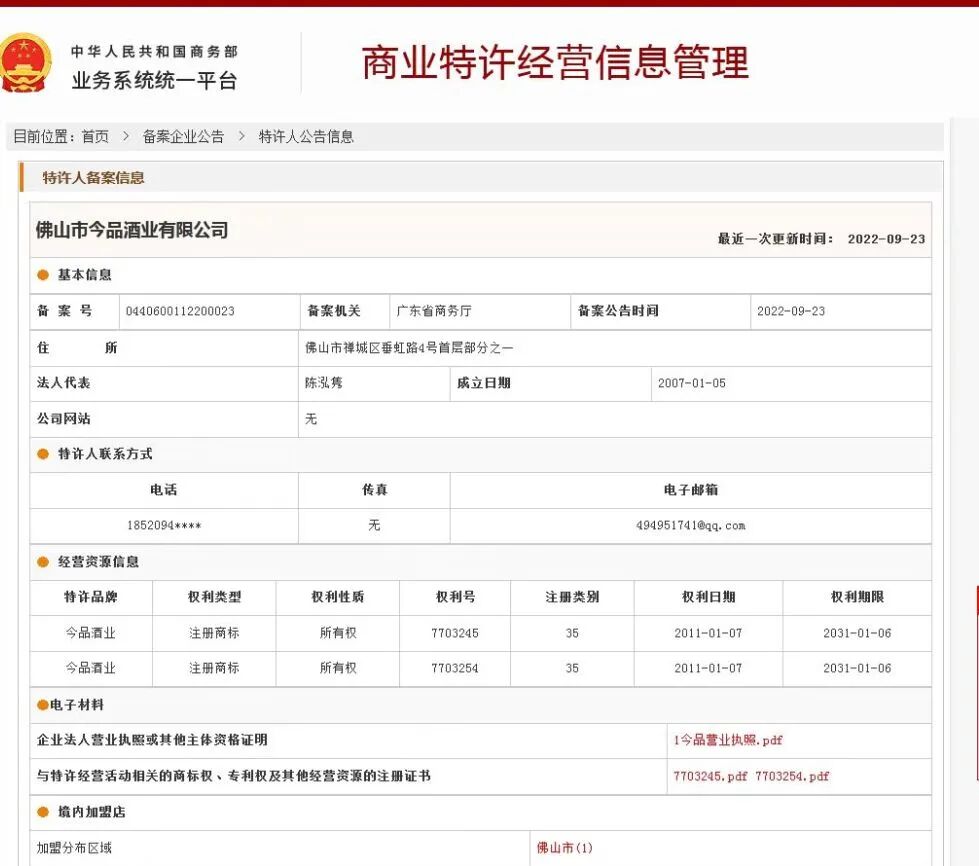 热烈祝贺我会常务副会长单位“广东省袁亮宏餐饮管理有限公司”和会员单位“佛山市今诚食品有限公司”“佛山市今品酒业有限公司”在广东省商务厅商业特许经营备案成功!