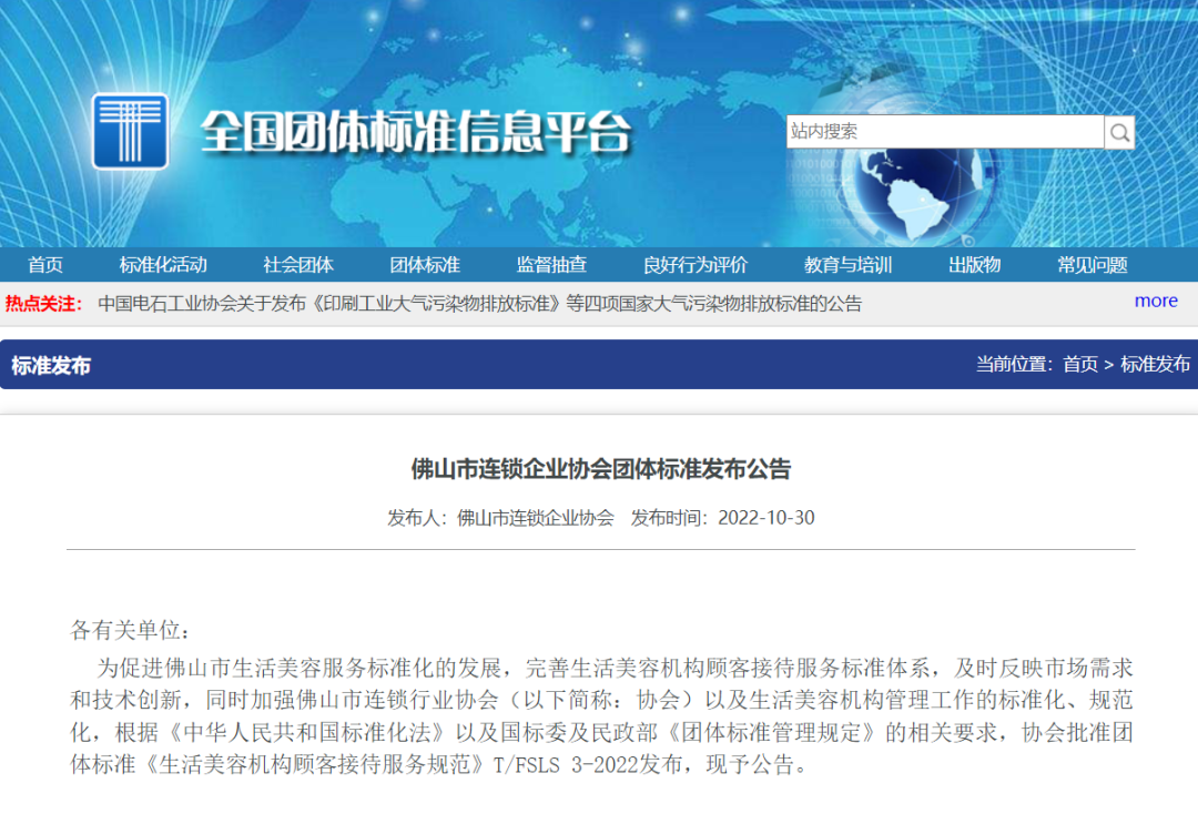 根据《中华人民共和国标准化法》以及国标委及民政部《团体标准管理规定》的相关要求,我会批准团体标准《生活美容机构顾客接待服务规范》T/FSLS 3-2022发布。热烈祝贺我会会长单位伊丽汇主导起草的《生活美容机构顾客接待服务规范》成为团体标准并正式发布实施。