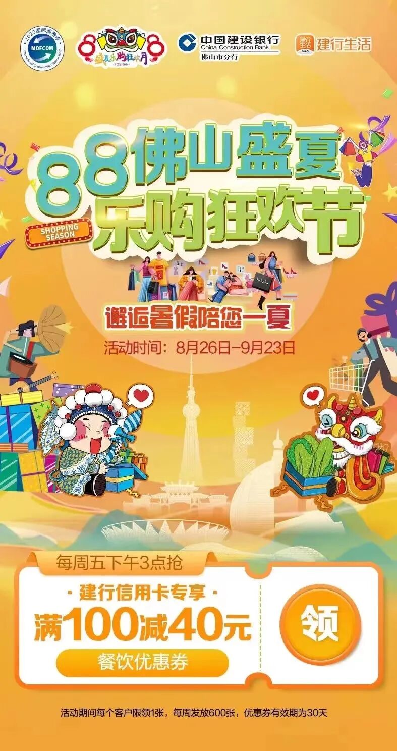 中国银联、中国建设银行、佛山农商行、南海农商行、顺德农商行等相关金融机构,佛山移动、苏宁、国美等电信、家电企业和电商平台在零售、餐饮、家居、电信服务等行业,推出消费券、折扣优惠券、代金券、满减券等方式,并叠加大型商业综合体、大型商超、电器专卖店、餐饮企业等商家促销资源,通过金融机构、商家双重优惠促销的叠加优惠,进一步在线上线下掀起全市的消费热潮。