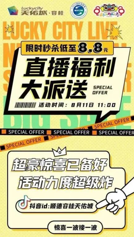 8月11日容桂天佑城直播福利大派送,活动力度超级炸,限时秒杀低至8.8元!