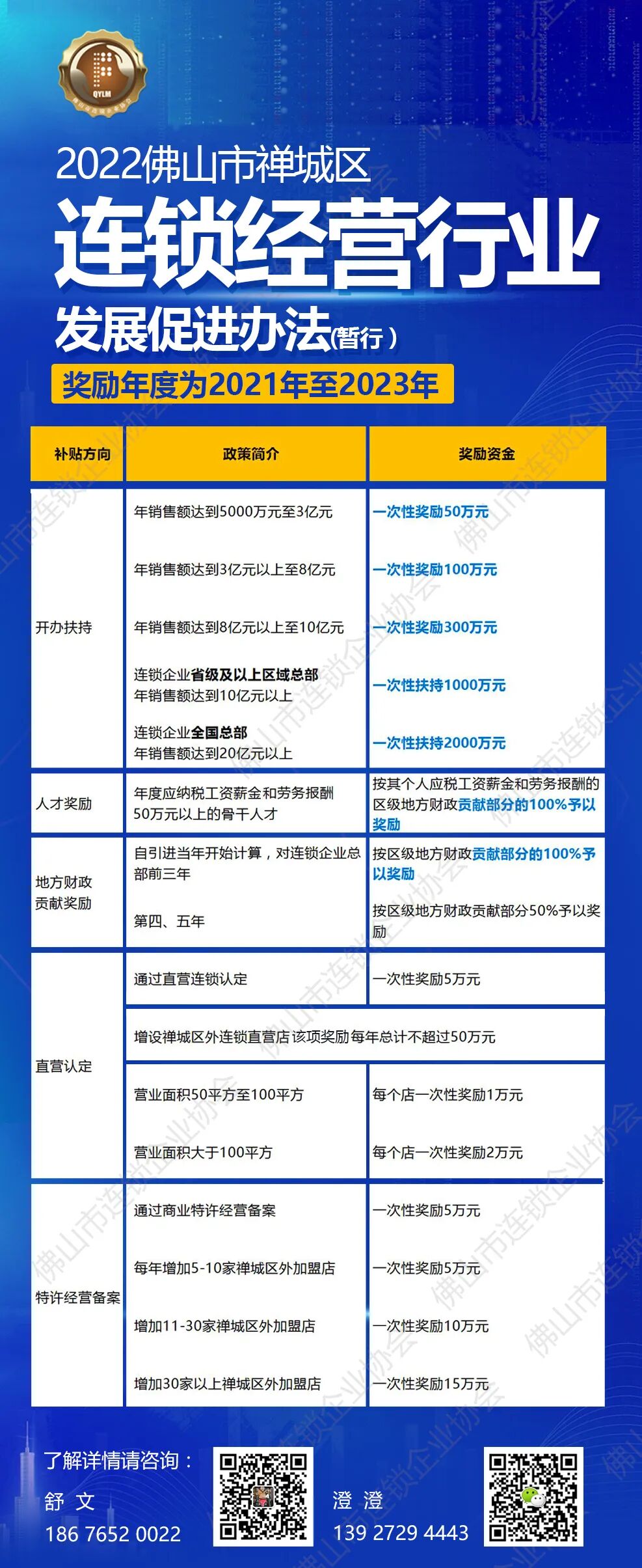 该《办法》是全国首个连锁企业专项扶持政策的“升级版”,涵盖开办扶持、人才奖励、特许经营备案奖励、直营认定奖励、拓店奖励、地方财政贡献奖励、引入扶持等。最高奖励2000万元‼