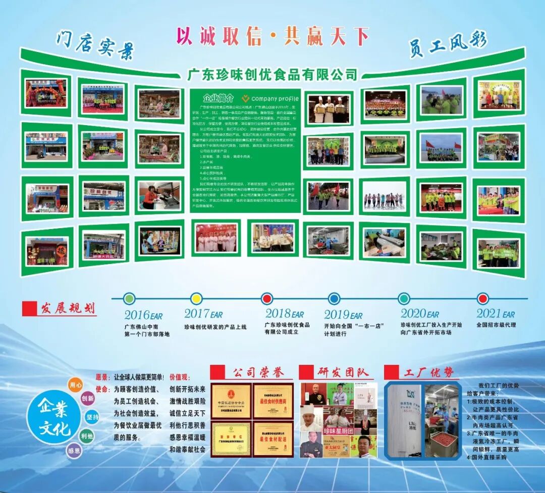 广东珍味创优食品有限公司公司地点:广东佛山,创建于2015年,集研发。生产,加工,销售一条龙自产自销服务。服务范围面向全国吉营合作“一市一店”给各城市餐饮行业提供一站式采购服务。产品定位:标准化配方,保管方便,使用方便,降低餐饮行业使用成本和营运成本。