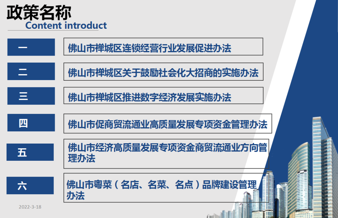 禅城区经科局商贸流通科-陈科为企业家们介绍2022年市区商贸商业类适用政策,也给大家带来了好消息!万众期待的连锁行业扶持办法即将出台,针对连锁企业将出台开办扶持、人才奖励、地方财政贡献奖励、首店经济奖励、连锁拓店奖励等奖励政策。