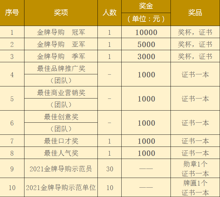 本届大赛将诞生金牌导购冠、亚、季军以及五个单项奖,冠军奖励高达一万元!