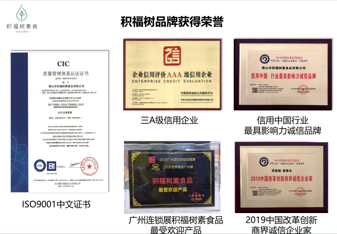 佛山市积福树素食品有限公司是一家定位于以素食食品生产供应链为中心,以麦当劳真功夫模式的中西合璧时尚素食快餐连锁、同时成为中国家庭餐桌素食厨师(让每个家庭都可以非常方便的购买到绿色、健康、美味素食品)为发展方向的大型综合性素食企业。