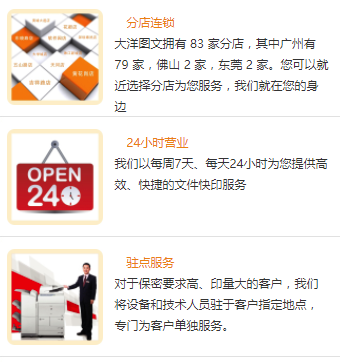 广州大洋图文数码快印有限公司成立于2000年初,在全体员工二十多年的努力下,现已发展成为华南地区规模较大的图文快印综合服务商之一。目前,公司共拥有图文快印连锁门店 83 家,其中广州市门店 79 家,佛山 2 家,东莞 2 家,员工六百多名,拥有施乐、惠普、佳能等高级数码印刷设备约贰佰余套。