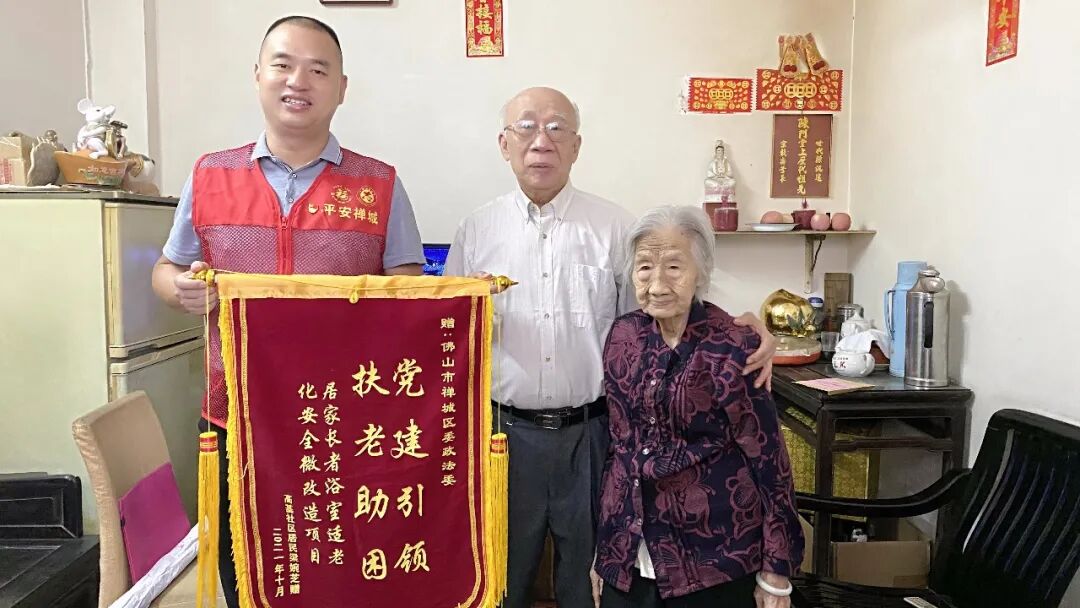 受助百岁老人家庭为禅城区委政法委送上感谢锦旗。