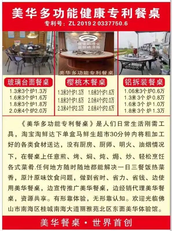 美华厨具公司研发的《美华多功能专利餐桌》,是人们日常生活刚需工具,淘宝淘鲜达下单盒马鲜生超市30分钟内将粗加工好的各类食材送达,没有厨房、厨师、明火、油烟情况下,在餐桌上任意煎、烤、焖、炖、焗、炒、轻松烹饪各式菜肴,任何地方随时随地都能解决一日三餐饭热菜香,原汁原味饮食问题,做到省时、省力、省钱、边使用美华餐桌,边宣传推广美华餐桌,边经销代理美华餐桌,资源共享。有形靠体验,无形靠认知。欢迎光临佛山市南海区桂城南海大道丽雅苑北区东面美华体验馆。