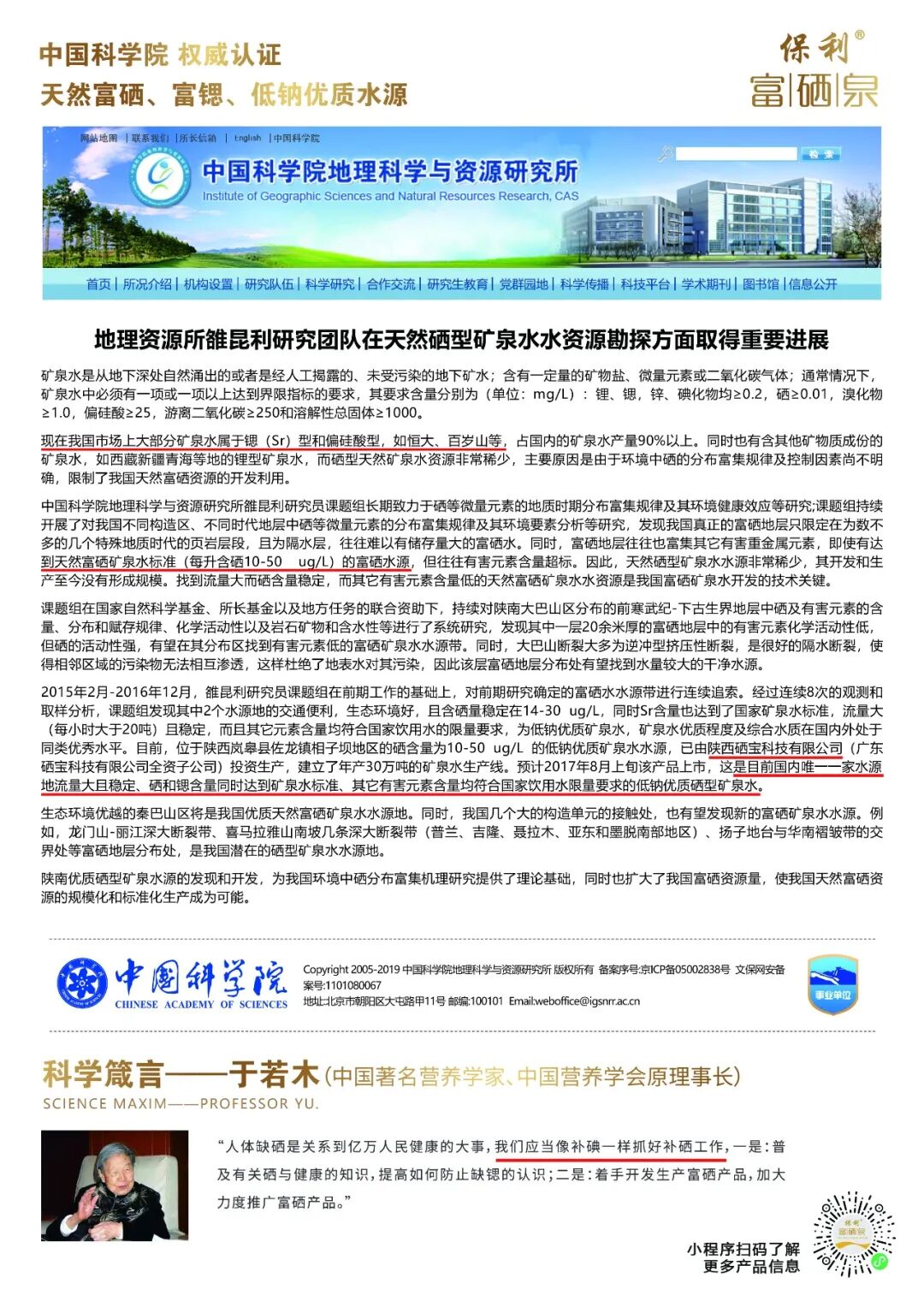 公司在创立之初,即与中国科学院地理科学与资源研究所签署战略合作协议,共建“硒资源综合开发实验室”,致力于天然富硒资源基础研究和天然富硒饮用水系列产品研发。探寻全国,历时6年,觅得世界罕见的珍稀富硒、富锶、含钼、低钠优质水源。