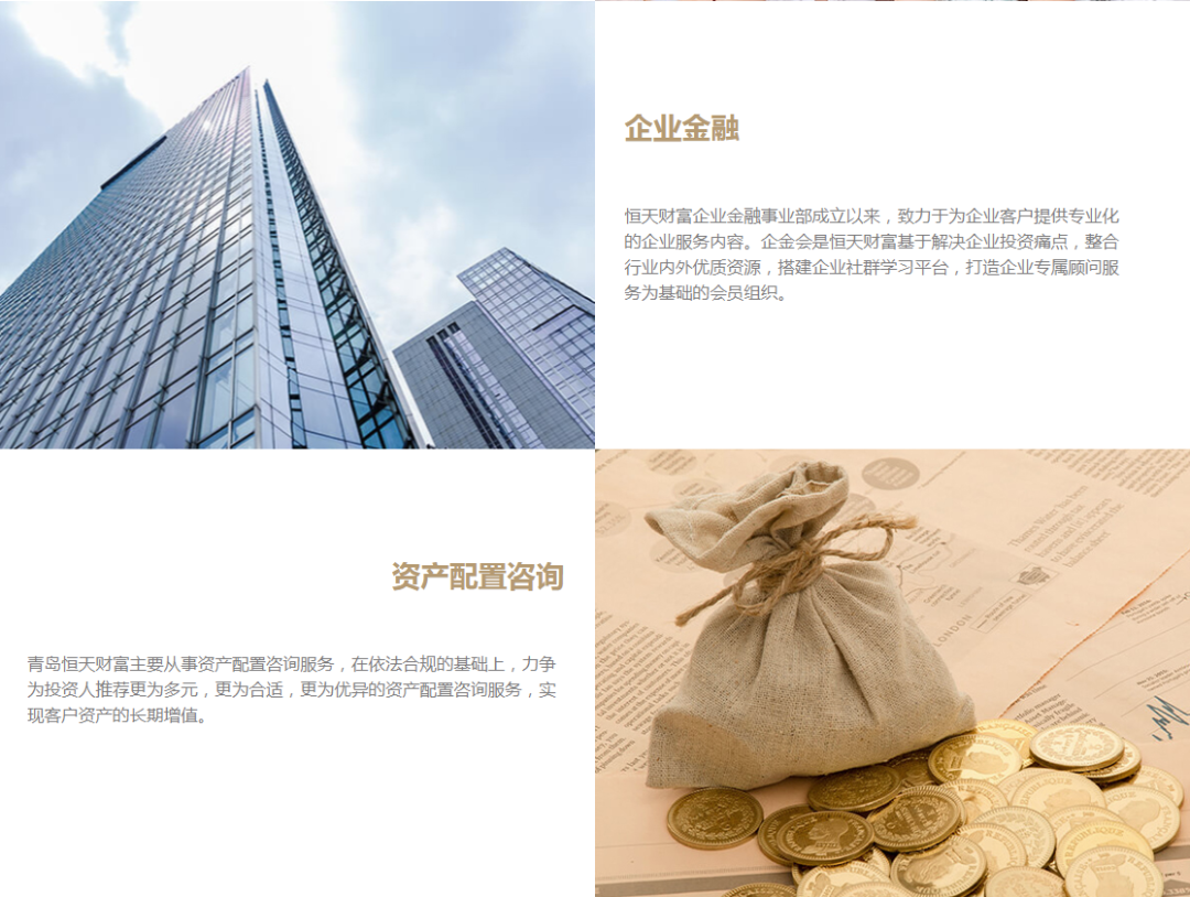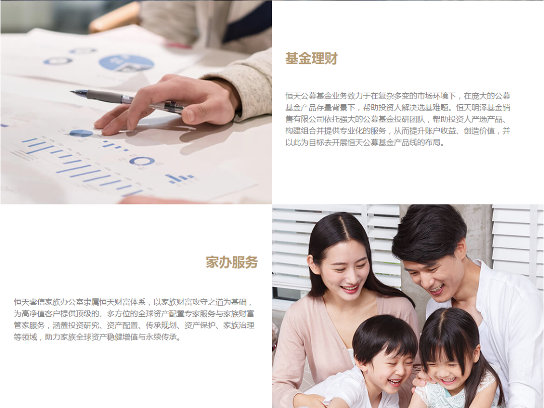 恒天基金在财富管理,资产管理,保险经纪等多个领域提供专业服务(私募基金管理,私募基金销售,公募基金销售,信托及定融产品)