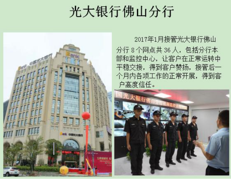 经过多年的发展,公司客户有中国农业银行佛山分行/南海分行、中国建设银行佛山分行、浦东发展银行佛山分行、民生银行佛山分行、光大银行佛山分行、中信银行佛山分行、平安银行佛山分行、佛山农商银行佛山分行、华润银行佛山分行、招商银行佛山分行、渤海银行佛山分行、广东南粤银行佛山分行、华兴银行佛山分行、东莞银行佛山分行、新华村镇银行、创兴银行佛山支行、大新银行佛山分行、南海农业发展银行、佛山农业发展银行、中银三星保险公司、前海人寿保险公司、澳门国际银行、招商局物业依云天汇、招商臻园、依云水岸、依云国际、广州瑞威经济发展有限公司(佛山西站商业区)、邮政仓储、汇丰银行广州分行、广州银行佛山分行、顺德农商银行南海支行、中国建设银行顺德支行、交通银行佛山分行、广发银行佛山分行、广州农商银行、天源玉器公司、佛山都市医院等二十多家单位提供保安服务,业务遍布佛山禅城、南海、顺德、三水、高明、江门等。