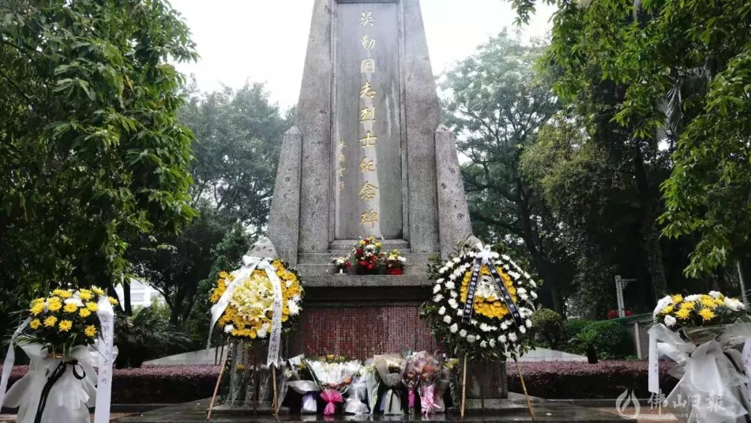 革命烈士吴勤纪念碑前摆满了党员同志献上的鲜花。图/佛山日报记者孙梦紫