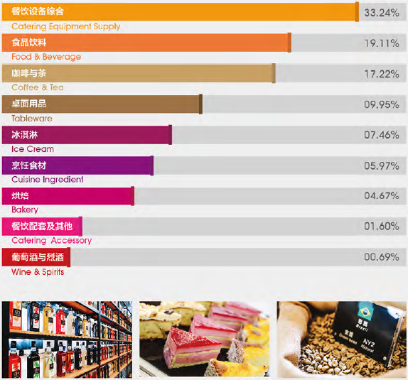 本次展会以《“食”来运转,而立绽放》为主题,分别设立了厨房设备与用品、桌面用品、餐饮食材、食品综合、饮品综合、咖啡与茶、冰淇淋设备及物料、烘培设备及原物料、酒类综合、食品餐饮包装、餐饮设计及配套、连锁加盟及餐饮投资共计十二个展品板块。除此之外,还特别加入了中央厨房精品展区、火锅食材展区、工业饮品及生产设备展区、休闲及功能食品展区、自有品牌展区、咖啡美食节、电商造物节、厨房辅助及刀剪展区8个特色展区,极大丰富了观众的参与体验。