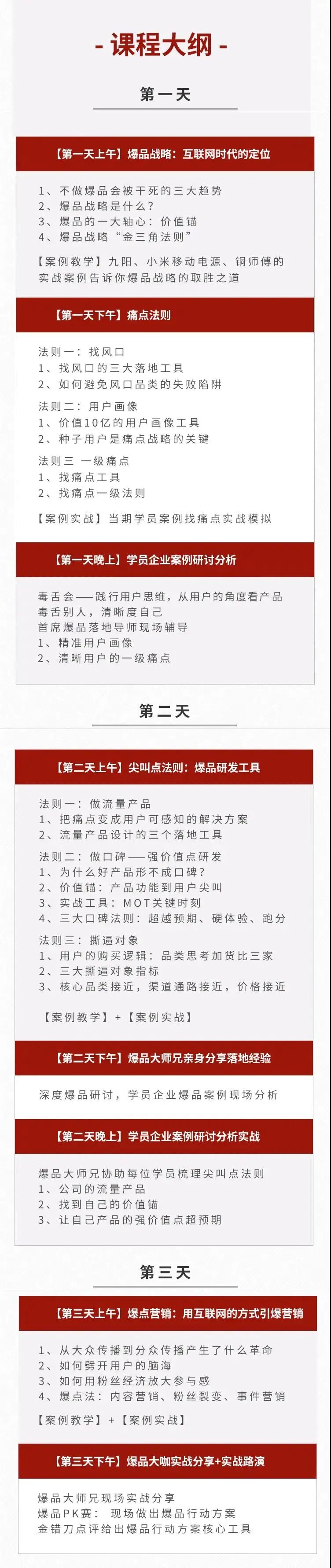 “爆品毒舌会”是低成本实现爆炸式增加的工具,产品以用户为中心,是实现产品与用户建立强信任的本质。企业创始人将切换身份,由付费用户与意向投资人的角度,深刻体会用户思维的重要性。 | ||||||