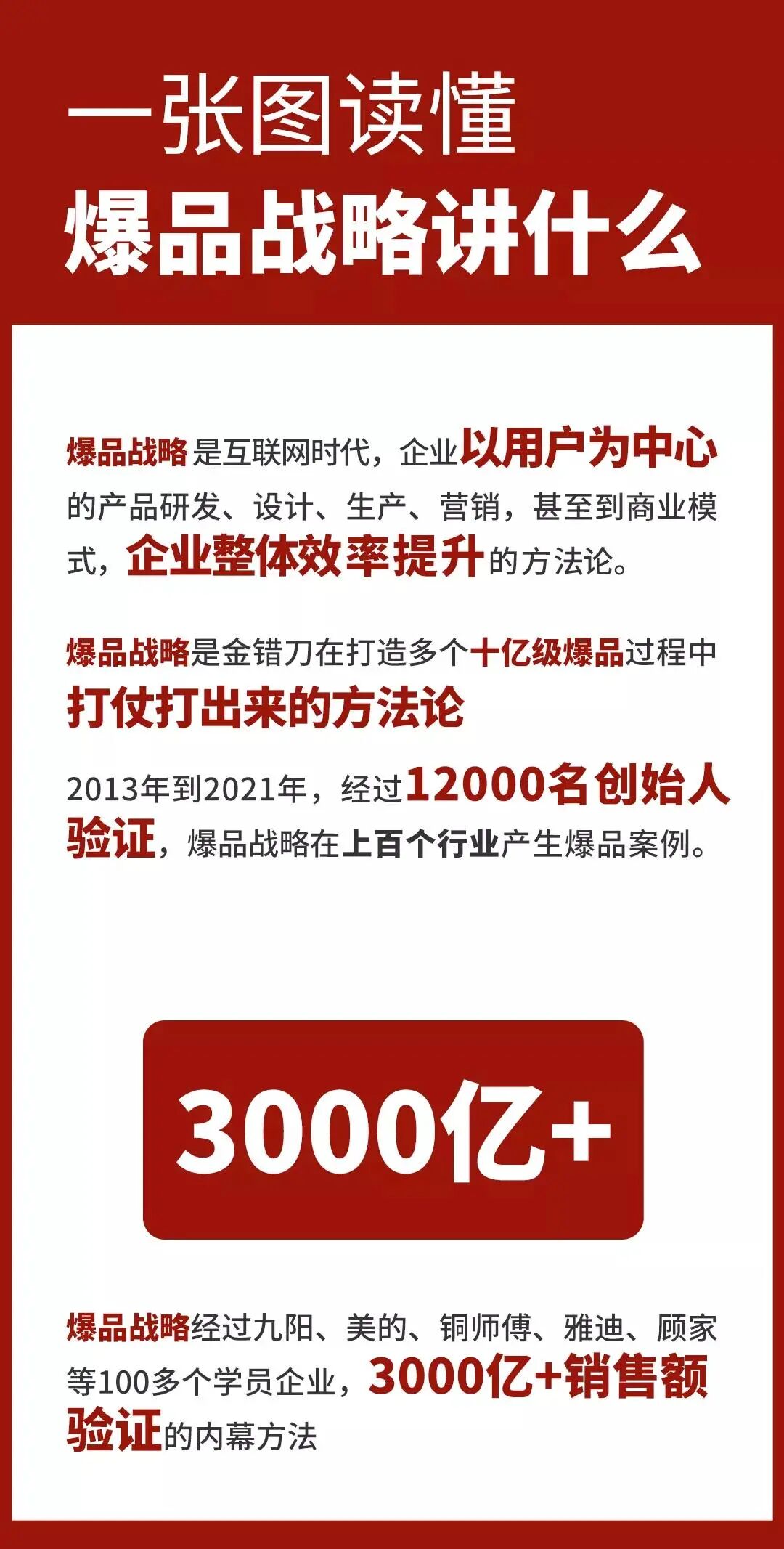 爆品战略经过小米、九阳、美的、铜师傅、雅迪、顾家等100多个学员企业,3000亿+销售额验证的内幕方法。