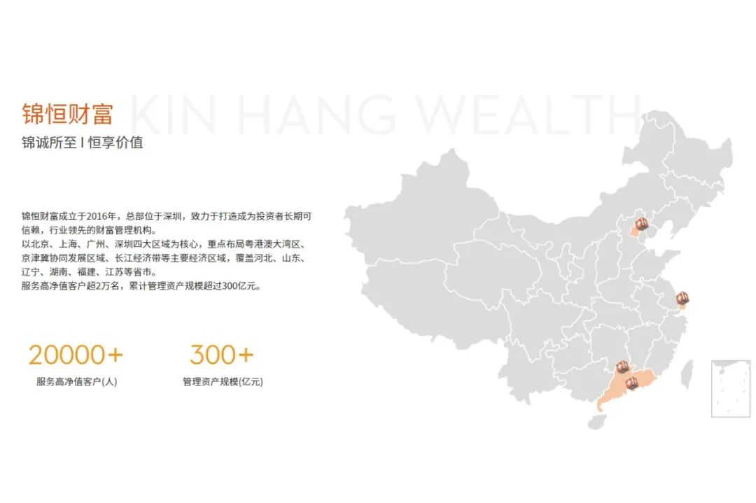 锦恒财富致力于打造成为投资者长期可信赖,行业领先的财富管理机构,以深圳、广州、北京、上海四大区域为核心,覆盖多个城市,服务高净值客户超2万名,累计管理资产规模超过300亿。成立以来所投项目0违约0逾期,为投资者不断创造投资收益。