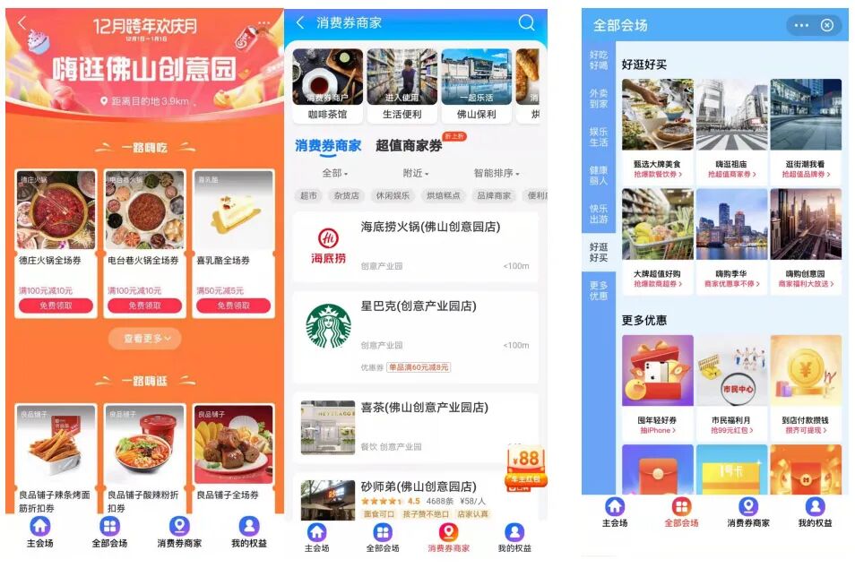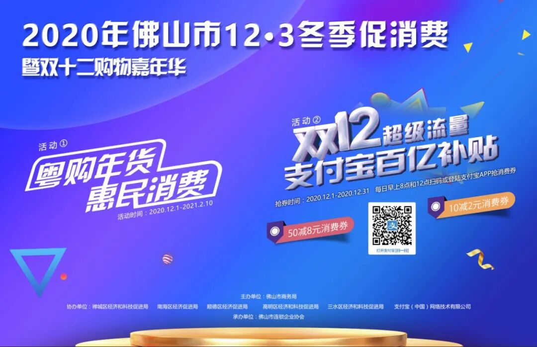 据介绍,佛山市商务局每年有四个季度的不同促消费活动,本次冬季促销费联合支付宝(中国)网络技术有限公司,由佛山市连锁企业协会组织全市各大商圈(步行街)、大型综合体、各商贸企业、餐饮企业在支付宝APP佛山本地生活服务平台设置双十二购物嘉年华活动专区,围绕餐饮、零售、文旅、休闲等本地生活消费全领域,引导商户开拓线上消费场景,通过发放消费券、推出红包补贴、特价爆款、超值券包等活动,促进线上线下双项融合,“到家”+“到店”场景贯通,激发消费热情,打造数字消费、品质消费。
