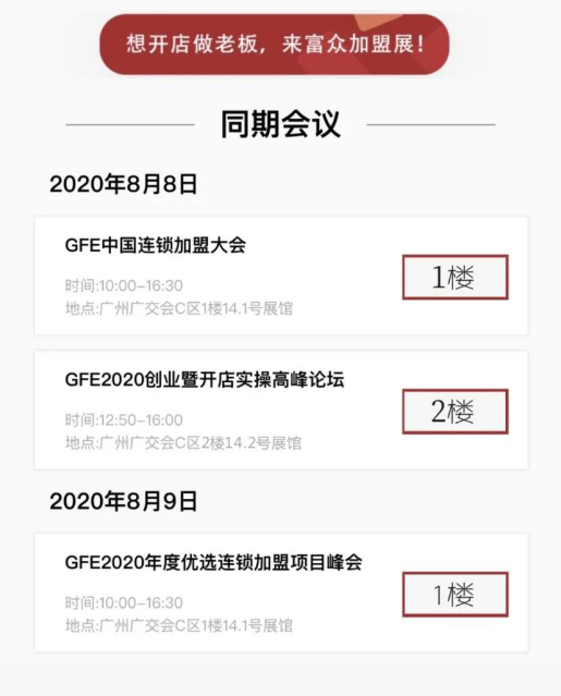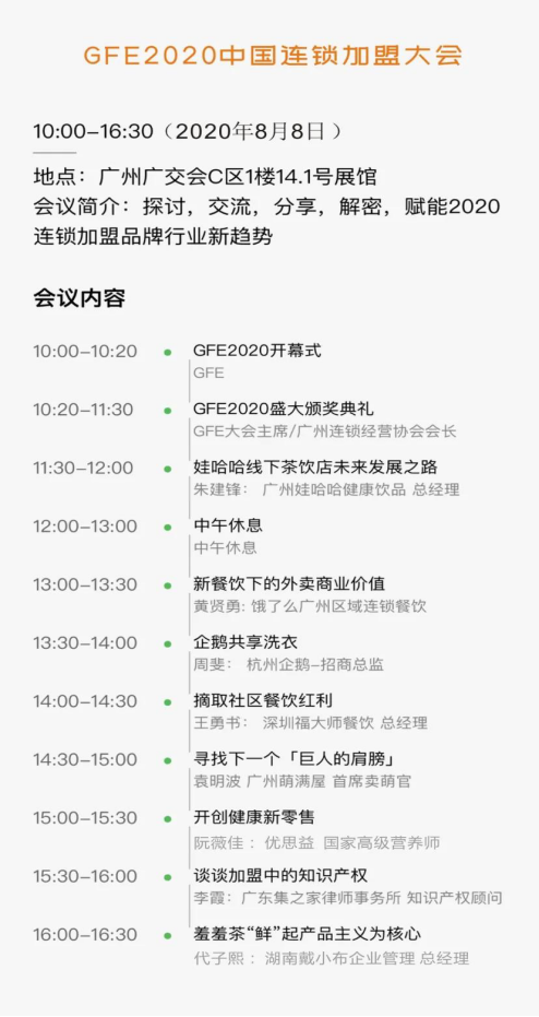 展会同期举办各论坛高峰会议活动,如2020GFE中国连锁加盟大会、GFE2020创业暨开店实操高峰论坛、GFE2020年度优选连锁加盟项目峰会、GFE2020十佳网络人气连锁加盟行业品牌大奖评选活动。届时将出席开幕式的领导有广州连锁经营协会、佛山连锁企业协会、广东省餐饮服务协会会长等负责同志,还有娃哈哈、饿了么、小米、抖音等行业大咖,探讨,交流,分享,解密,赋能2020连锁加盟品牌行业新趋势。
