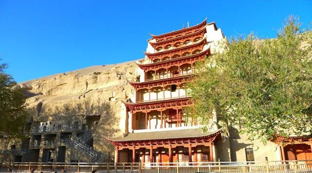 【千年莫高、梦幻佛宫】(观看40分钟)后乘摆渡车(约20分钟)赴莫高窟景区,抵达后参观举世闻名的世界文化遗产、佛教艺术宝库【莫高窟】238元(参观75分钟),始建于前秦苻坚建元二年(公元366年),拥有洞窟492个,壁画45000多平方米,彩塑像2000余身,是古建筑、雕塑、壁画三者相结合的艺术宫殿,俗称千佛洞,后乘摆渡车(约20分钟)返回游客中心。