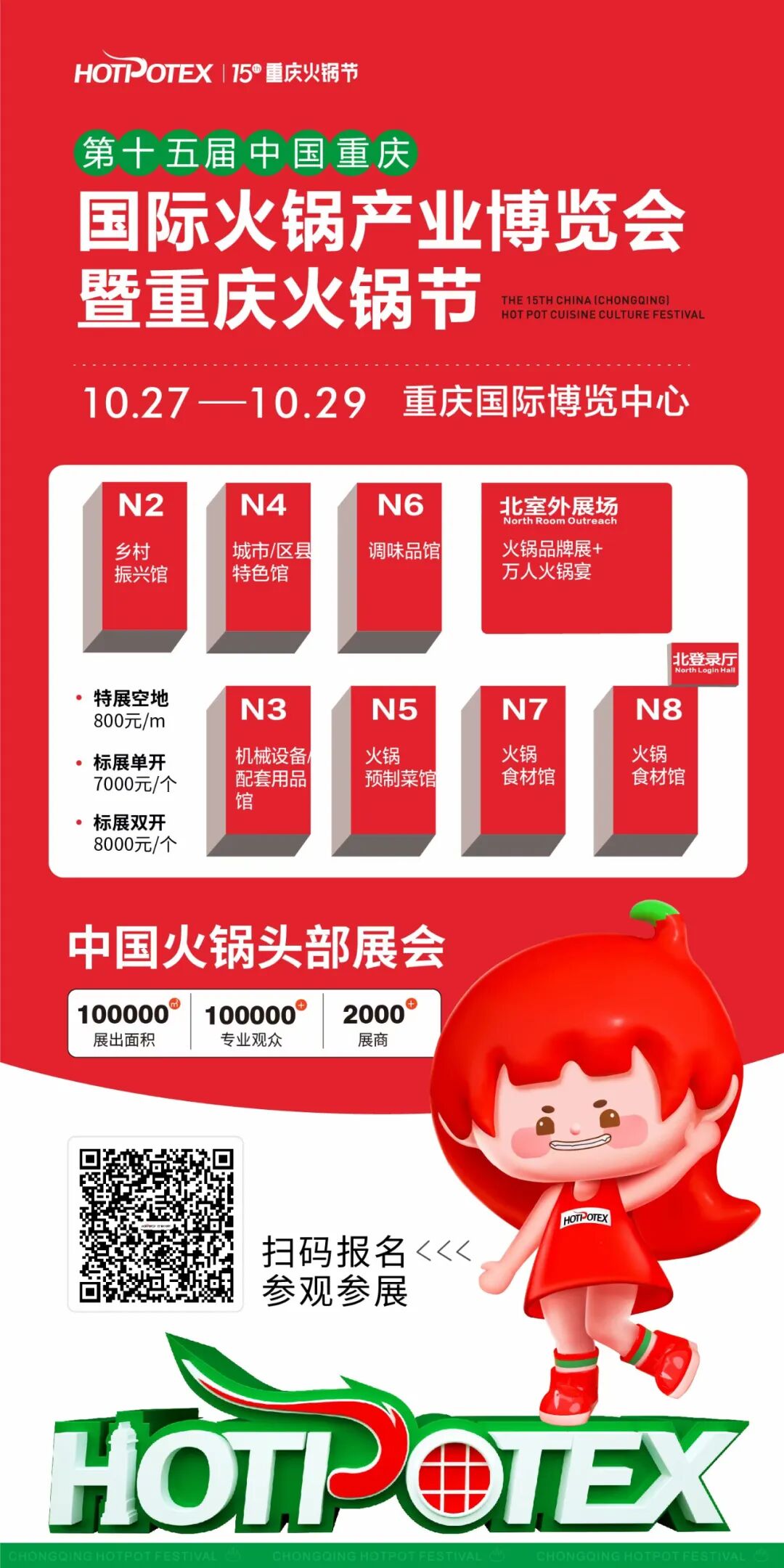第十五届中国(重庆)火锅美食文化节暨第八届中国(重庆)国际火锅产业博览会,10月27-29日将于重庆国际博览中心隆重举办。第十五届重庆火锅节开设火锅品牌、火锅食材、调味品、预制菜、机械设备、配套用品、城市特色7大展区,展出面积100000㎡、专业活动20+项、参展商2000+、展品50000+、专业观众100000+(预计),纵深融合中国火锅全产业链企业,为火锅品牌连锁加盟与投资,火锅产业上下游企业产销对接,发掘火锅新品爆品提供精准匹配的专业平台。