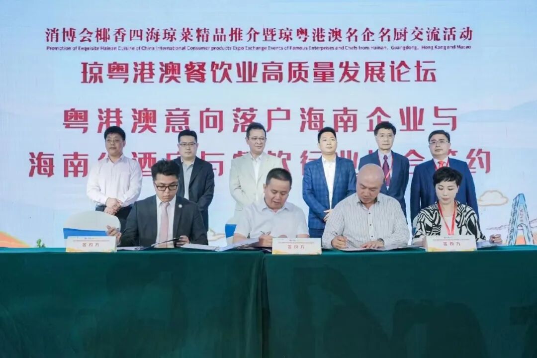 消博会椰香四海琼菜精品推介暨琼粤港澳名企名厨交流活动重要组成部分取得成果—琼粤港澳餐饮业高质量发展论坛暨交流活动总结仪式在海口举办,名厨技艺交流直播吸引近20万人观摩,88道精品琼菜传播海南味道。会上,海南省酒店与餐饮行业协会分别和广东省食文化研究会、广东省粤菜产业发展促进会、香港现代管理(饮食)专业协会、香港餐饮联业协会、香港国际厨艺交流协会、澳门美食同业联合商会、澳门餐饮行业协会、澳门餐饮业联合商会签署友好合作协议,就“领导班子互访互通机制、双方重大活动支持机制、加强两地菜品菜系交流、实现名特优质食材共享、品牌共建优化招商平台”等方面开展友好合作。