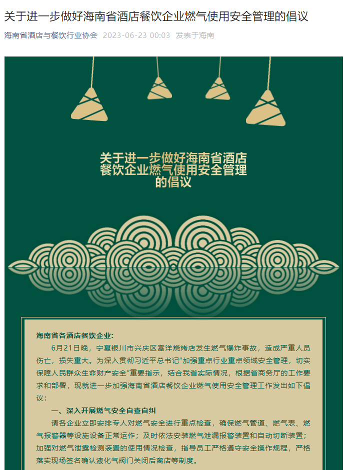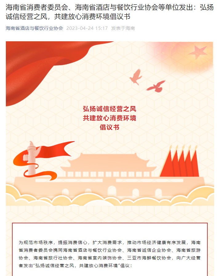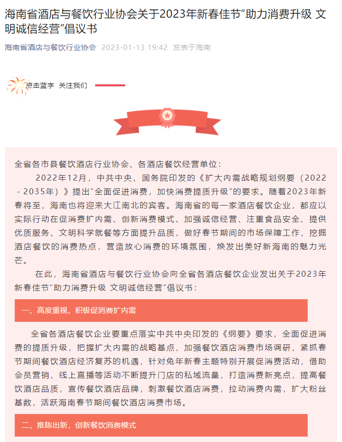 海南省酒店与餐饮行业协会发布关于2023年新春佳节“助力消费升级 文明诚信经营”倡议书。