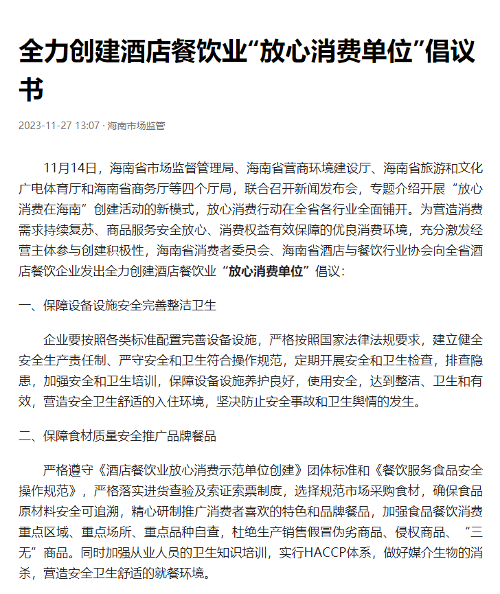 为营造消费需求持续复苏、商品服务安全放心、消费权益有效保障的优良消费环境,充分激发经营主体参与创建积极性,海南省消费者委员会、海南省酒店与餐饮行业协会向全省酒店餐饮企业发布全力创建酒店餐饮业“放心消费单位”倡议书。