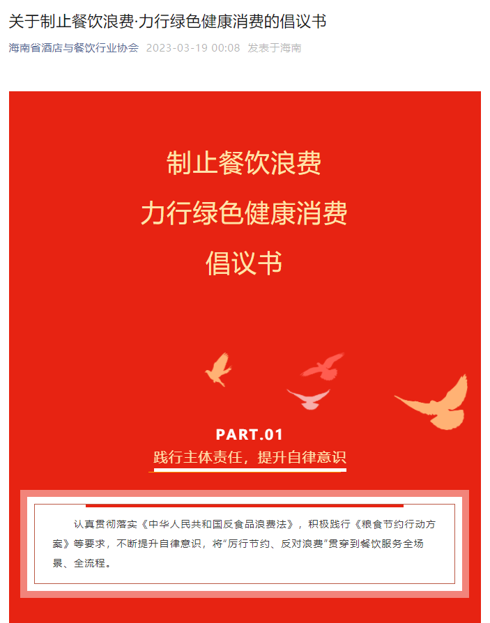 海南省酒店与餐饮行业协会发布关于制止餐饮浪费·力行绿色健康消费的倡议书。