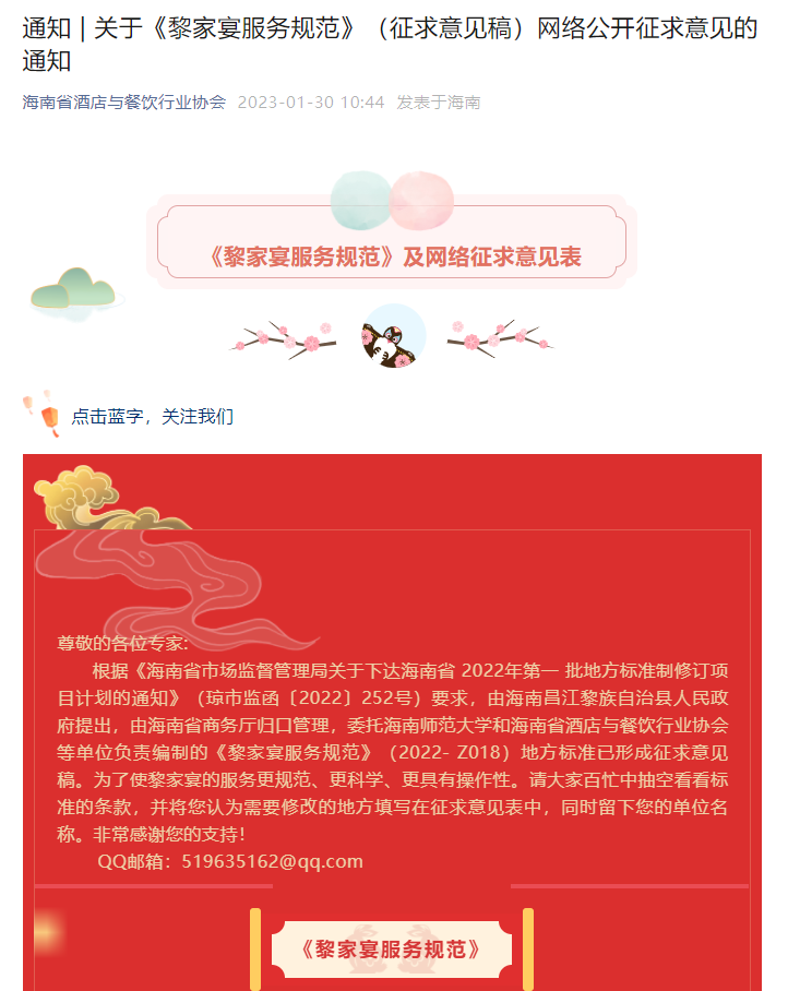 海南省酒店与餐饮行业协会发布关于《黎家宴服务规范》(征求意见稿)网络公开征求意见的通知。