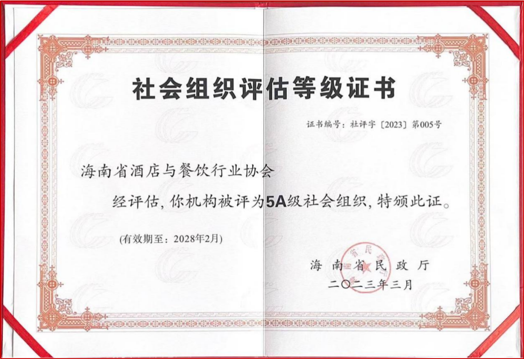 海南省民政厅发布《海南省2022年度社会组织等级评估结果公告》,海南省酒店与餐饮行业协会在全省性社会组织等级评估中荣获最高等级——5A级社会组织称号。